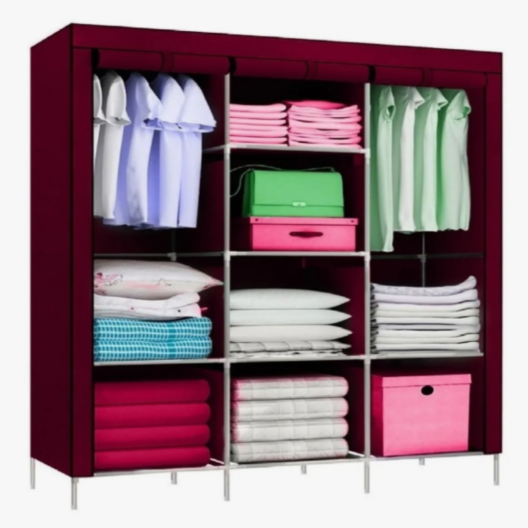 Optimiza el espacio de tu dormitorio con el ropero organizador armario closet de tela, diseñado para ofrecer orden y accesibilidad. Su estructura ligera de tubos metálicos con conectores plásticos garantiza resistencia y durabilidad, mientras que la cubierta de tela con cierre enrollable protege tu ropa del polvo. Cuenta con tres secciones amplias para colgar prendas y múltiples repisas para acomodar accesorios o ropa doblada. Fácil de montar y desmontar sin herramientas, es ideal para espacios pequeños y ambientes temporales, combinando funcionalidad y practicidad con un diseño modular y portátil.
