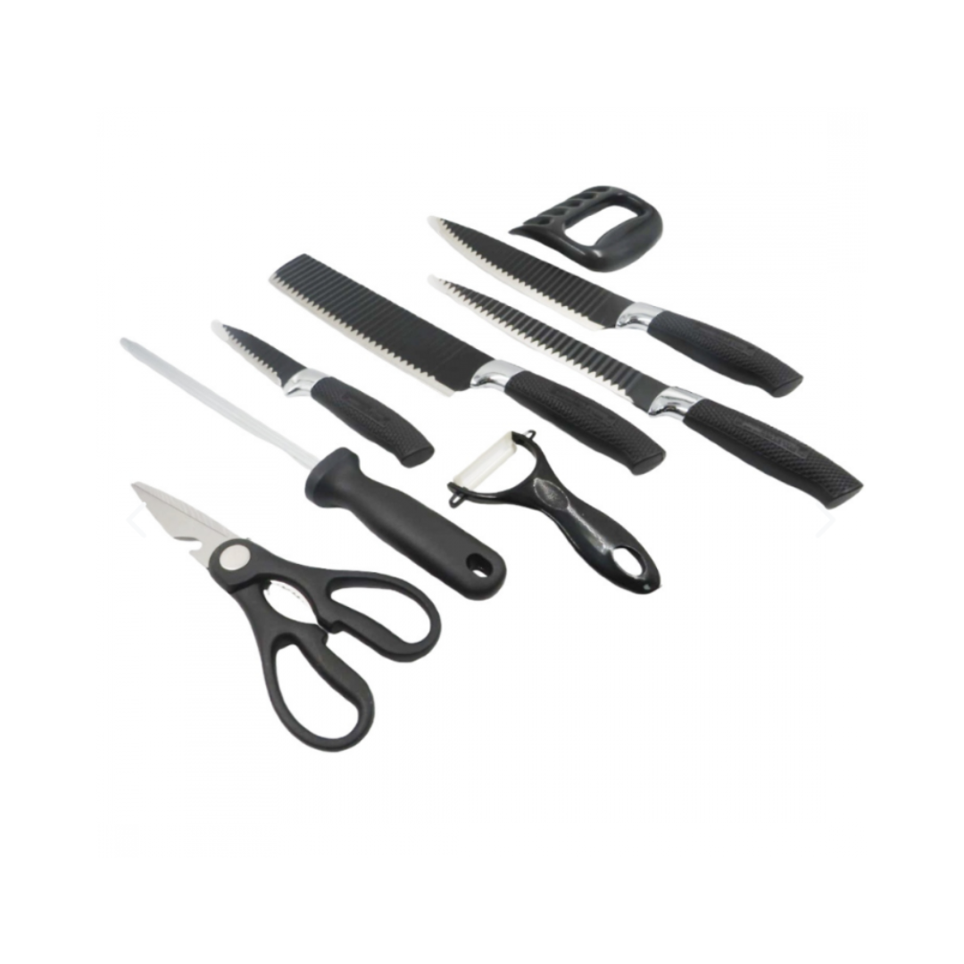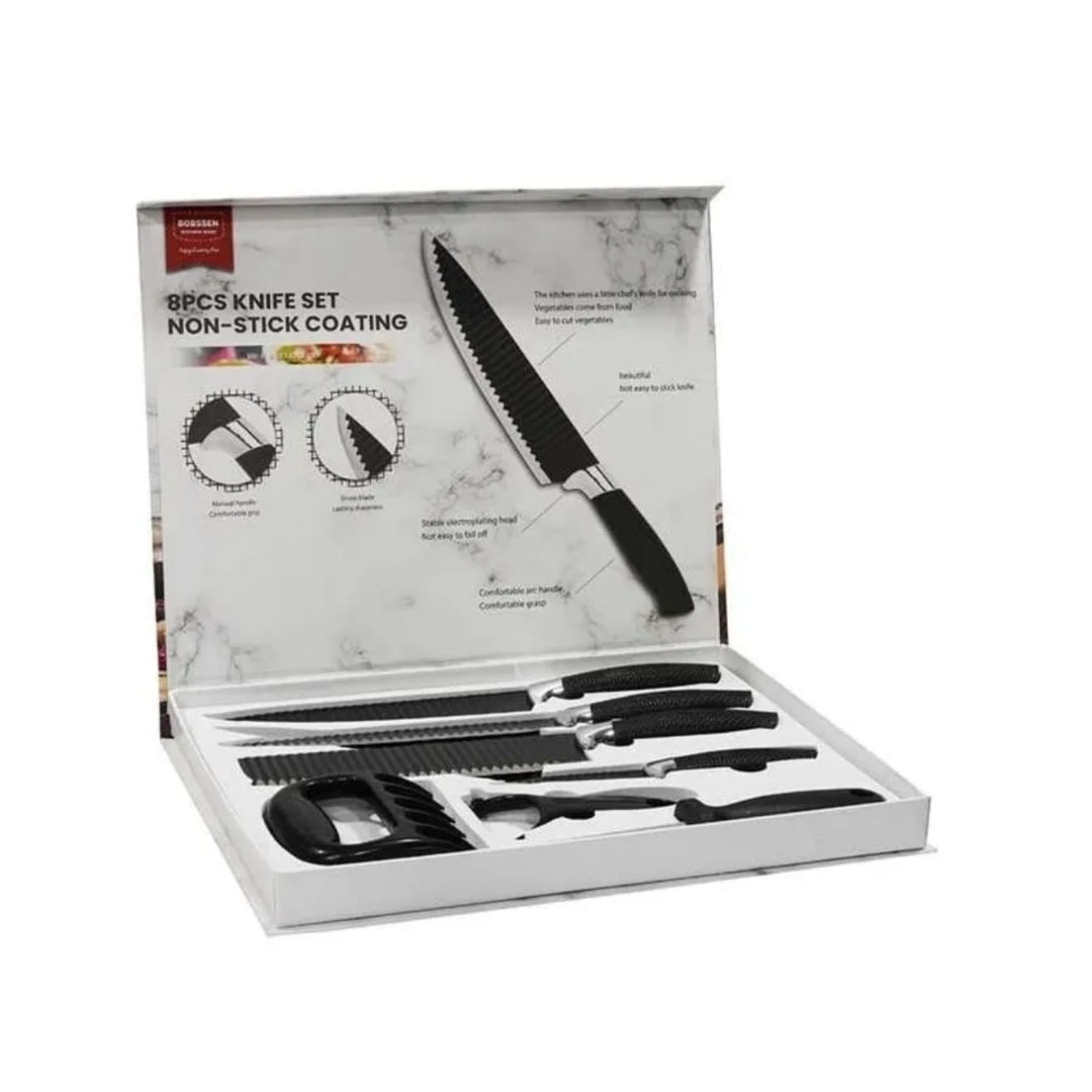 Este set de 8 cuchillos de cocina profesional está diseñado para cubrir todas tus necesidades culinarias con precisión y durabilidad. Fabricados con acero inoxidable de alta calidad, sus cuchillas mantienen el filo por más tiempo y cuentan con un recubrimiento antiadherente que evita que los alimentos se peguen, facilitando cortes rápidos y limpios. Su diseño combina elegancia y funcionalidad, ofreciendo una experiencia culinaria superior para chefs exigentes que buscan rendimiento y estilo en cada herramienta. Ideal para trinchar, picar y cortar con máxima eficiencia.